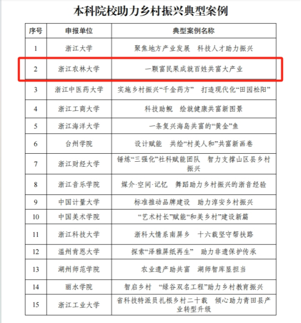 近日,浙江省教育廳發布了第三屆高校助力鄉村振興典型案例評選結果。我校推選的《一顆富民果成就百姓共富大產業》成功入選,成為全省15個本科院校助力鄉村振興典型案例之一,這也是我校連續三年獲此殊榮。該項目近期還入選了教育助力高質量發展建設共同富裕示范區典型案例。