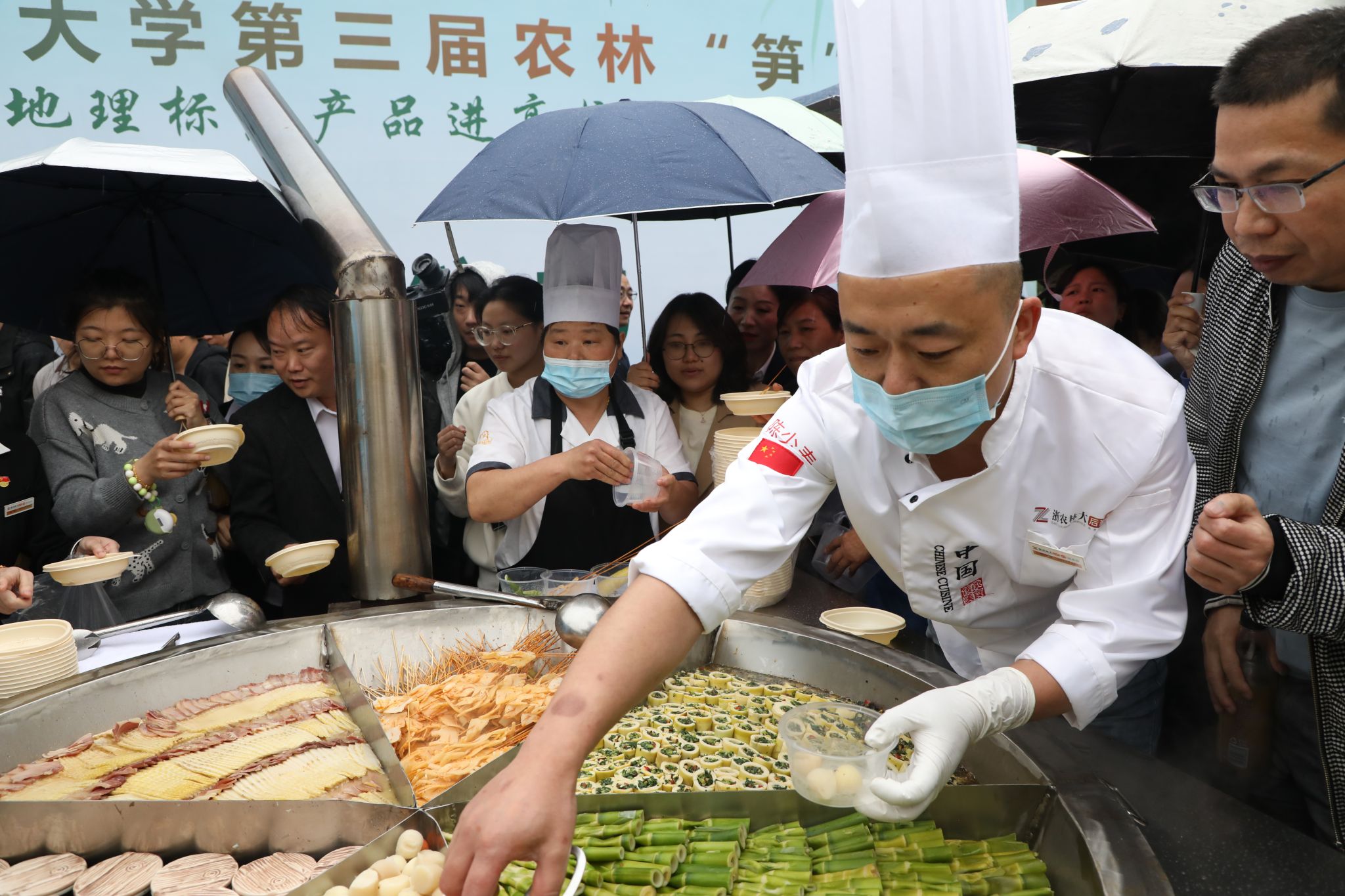 浙江師范大學、杭州電子科技大學、浙江工商大學、嘉興大學、湖州師范學院等五所高校代表、各食堂廚師以及美食檔口,展示了東坡金錢筍、蝦湯花膠驚雷筍、宋韻傳——山河匯、八寶菱筍合璧、飛英春意宴江南等竹筍菜肴,供現場師生免費品嘗。