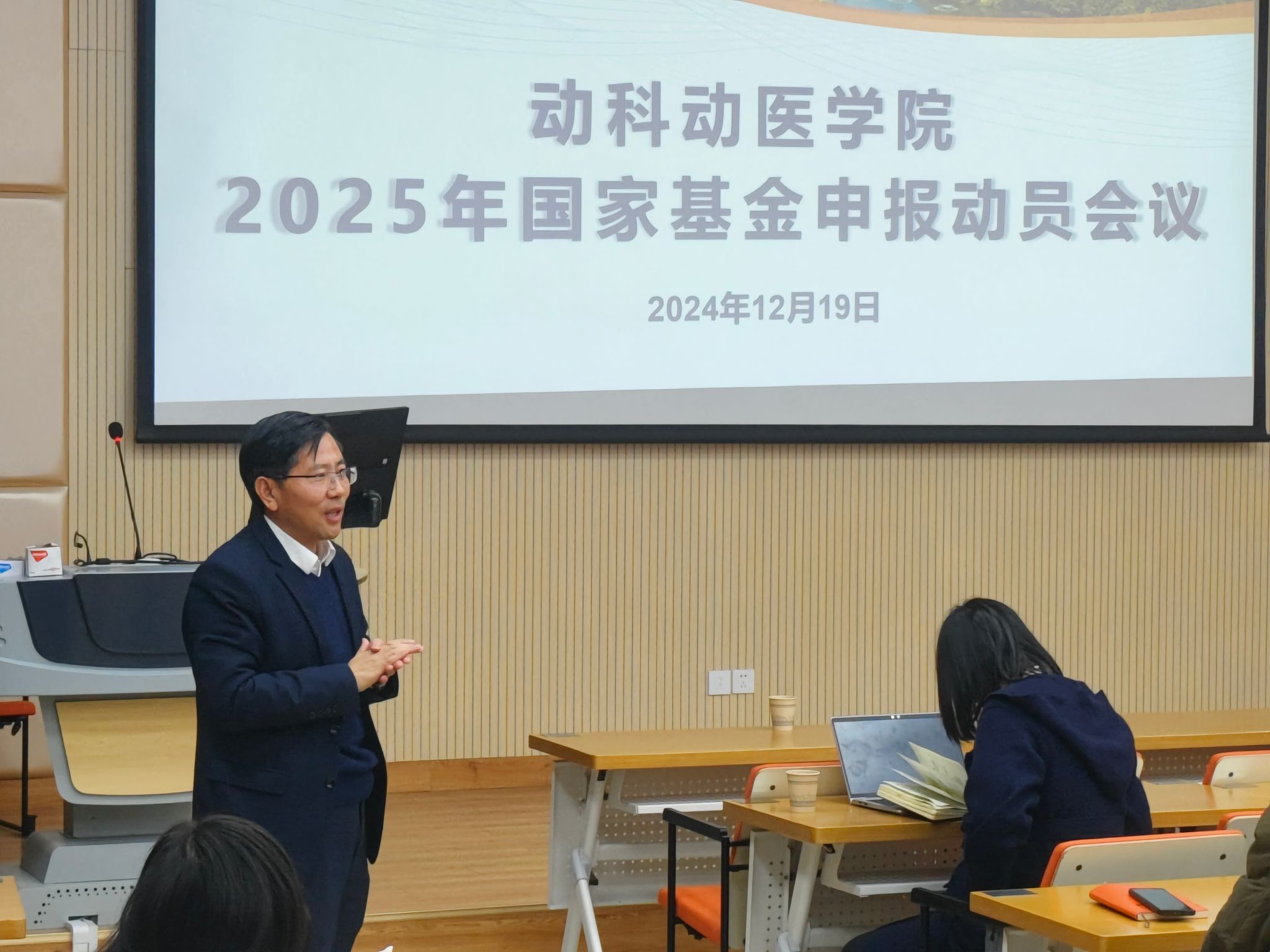 12月19日,動科動醫學院召開2025年國家基金申報工作動員會議。會議邀請了浙江大學師福山教授作申報輔導報告。學校科技處相關負責人,動科動醫學院院長宋厚輝、書記魏玲玲參會,近100名師生參加。