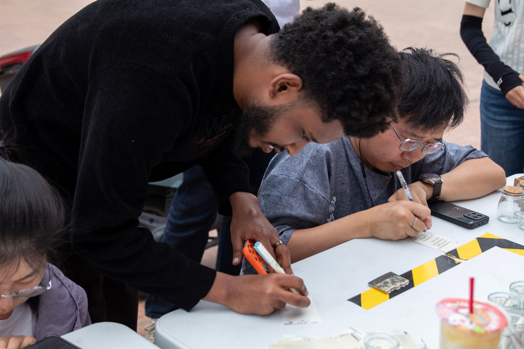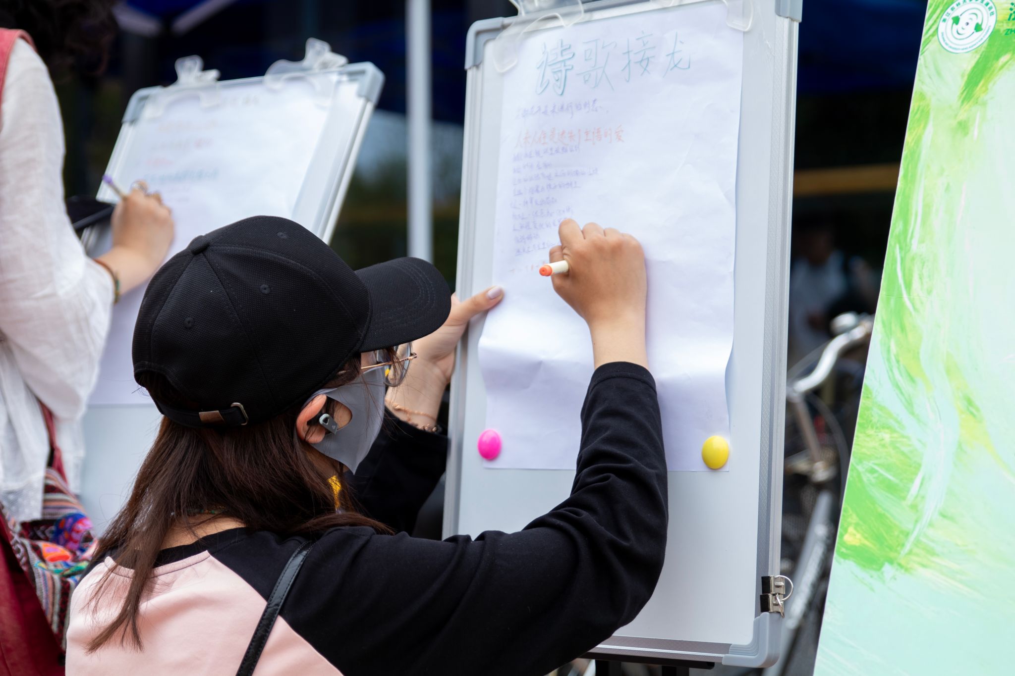 活動內容涵蓋詩歌交換和詩歌接龍。參與者們以一首詩交換許愿瓶中的匿名短詩,用記號筆書寫自己的詩句,接力完成整首詩篇。現場還有書法協會的同學揮毫潑墨,為大家書寫詩詞相關的書簽,定格美好時光。